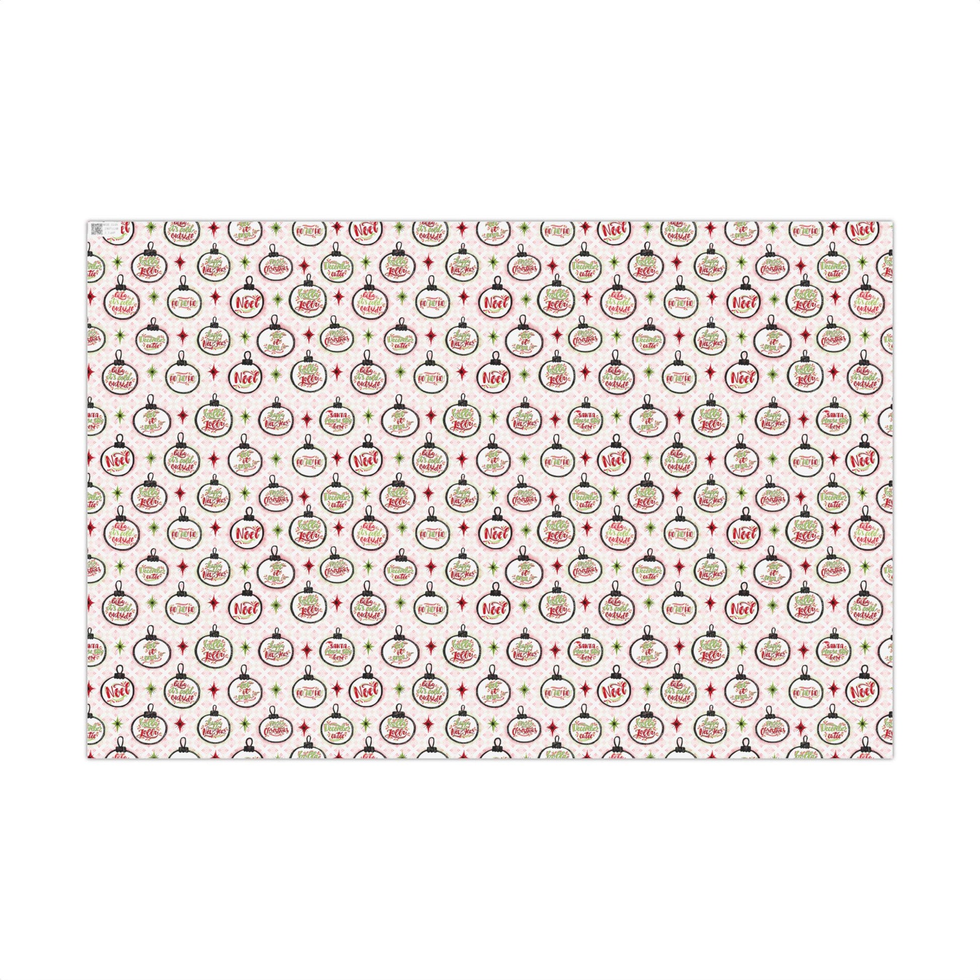 ADORN© your gifts with modern twist on a classic theme! Our Vintage Christmas Quotes Wrapping Paper is perfect for adding a classic yet modern touch of holiday red and green cheer. This stunning paper features bold and modern illustrative ornaments, adorned with festive, scripted quotes like "December Cutie," "Ho, Ho, Ho," "Baby It's Cold Outside," "Noel," "Holly Jolly," and "Santa, Stop Here."