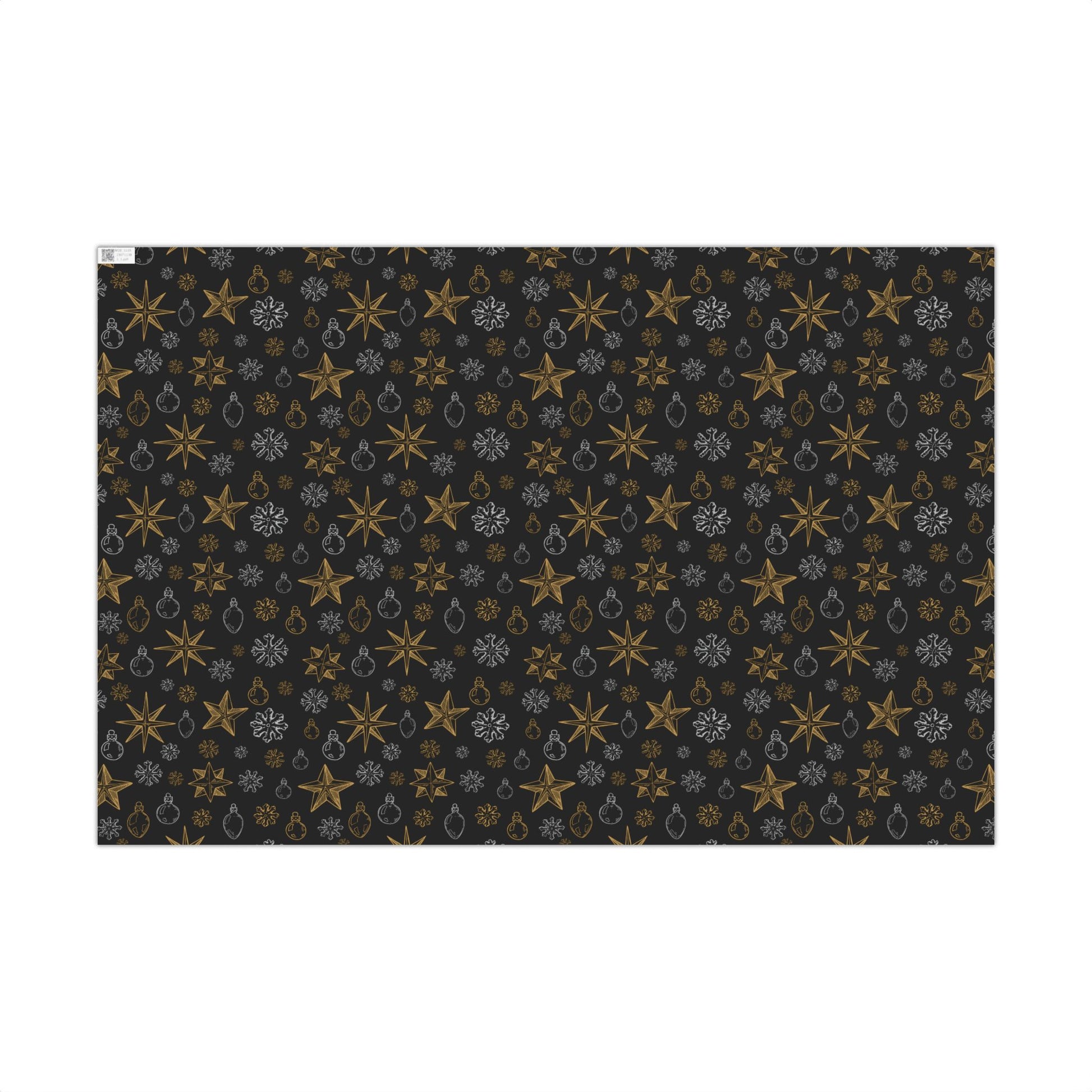 This paper is the definitive traditional choice for those seeking a luxurious, high-end look. It features a clean, crisp pattern of iconic ornaments, snowflakes, and stars rendered exclusively in shimmering silver and gold metallics reversed against a black background. The Brightest Stars are Under the Tree This Year.